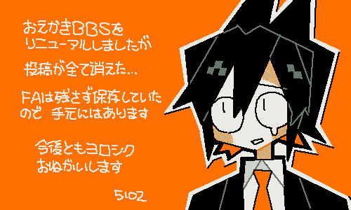 さて、投稿が全部消えて掲示板がまっさらになってしまいましたが、今までここで描いて頂いたファンアートは画像で全部保存しています。